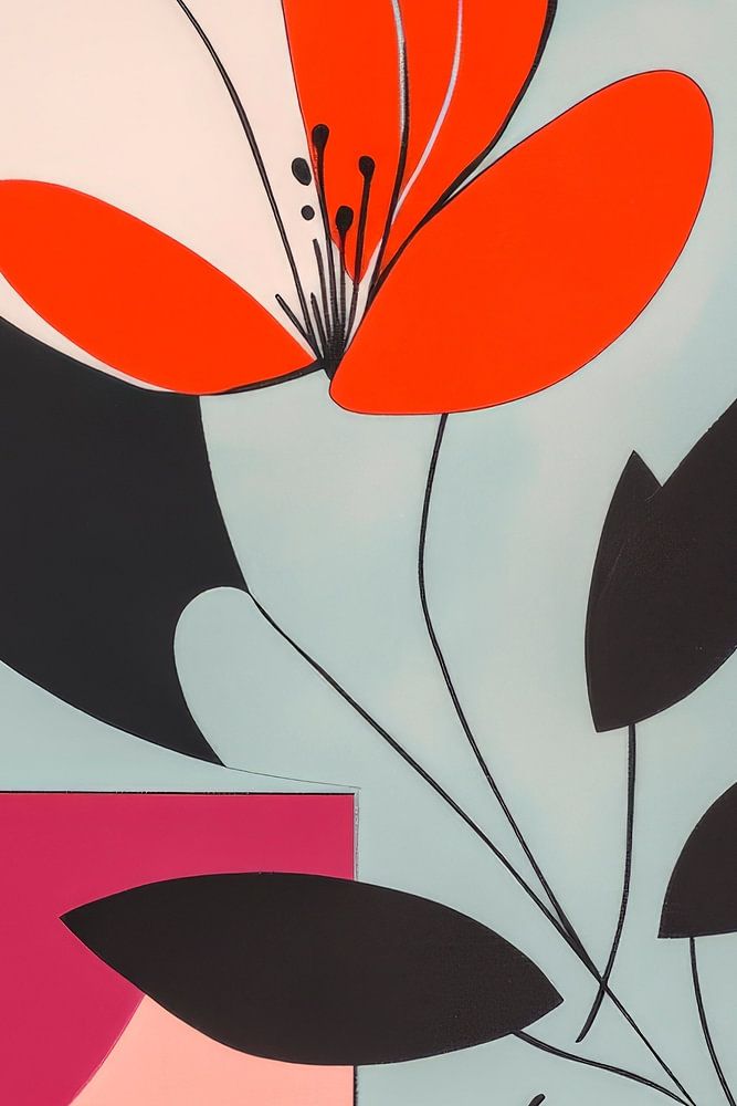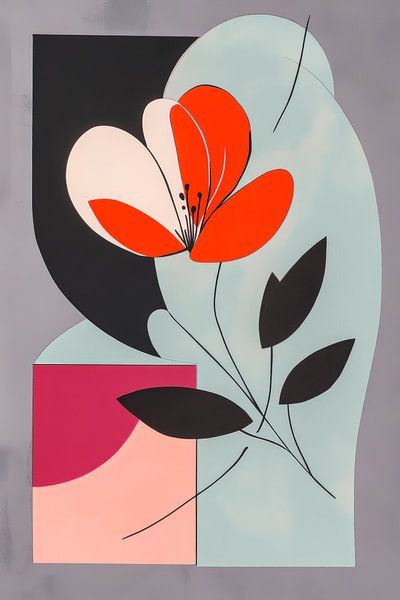 A powerful flower blossoms in harmonious colours and stylised shapes, promising joie de vivre. The vibrant shades of red and black contrast elegantly with soft pastel colours and lend a modern flair to any room. Ideal for the living room, this work of art brings a breath of fresh air and a touch of nature into everyday life.