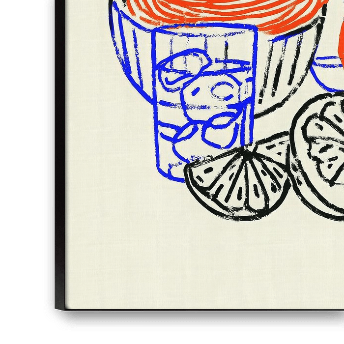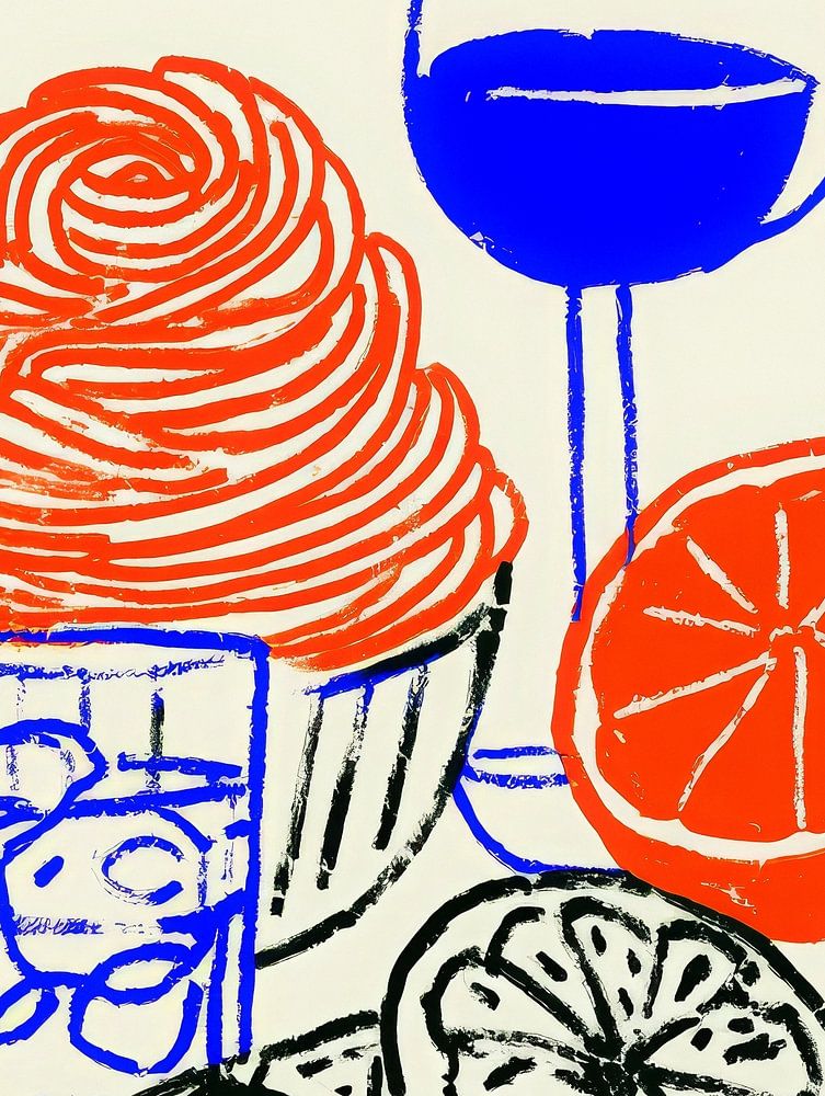 This minimalist illustration combines food and drink in a fresh and contemporary way. A glass of wine, a bowl of ice, slices of citrus and a drink with ice cubes combine to form a vibrant still life. The red and blue lines create a powerful colour contrast that immediately catches the eye. Despite the simple design, the image exudes energy and summer cheerfulness. The sketchy style makes it airy and modern, as if straight out of a designer's sketchbook. Each element is recognisable, but stylised to its essence. The composition is playful and balanced, with a subtle sense of rhythm and repetition. The use of primary colours gives it a timeless, almost graphic look. This artwork captures the spontaneity of a summer evening full of flavour and colour. Perfect for those who love design, simplicity and a touch of retro flair.