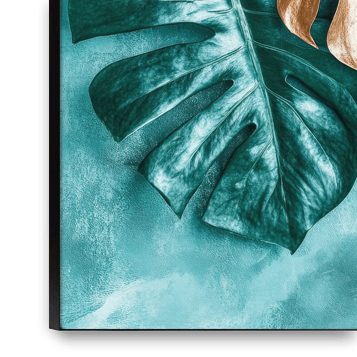 Lush leaves unfold in a harmonious dance of colours, contrasting in deep green and shimmering gold. The cool background conveys a sense of calm and freshness, while the veins of leaves pulsate with life as if they were alive. This composition radiates a subtle elegance and invites you to dream.