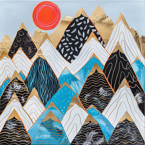 These mesmerising paintings combine the elements of the mountain landscape with a modern, abstract aesthetic. The golden mountain peaks glow against a dramatic background of blue and black tones, while an intense red moon dominates the sky. The flowing lines and harmonious colour palette of gold, blue and red create a stunning yet…