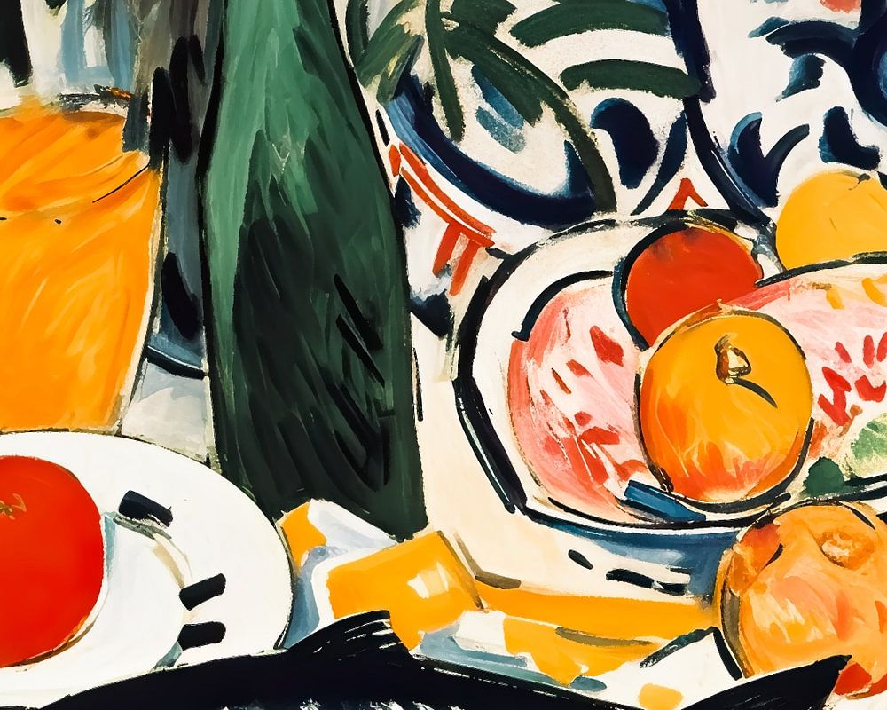 This modern painting is an expressive depiction of a summer dining room still life. The still life consists of a fish, fruit, plants and a beer bottle with half-filled glass standing on a table.