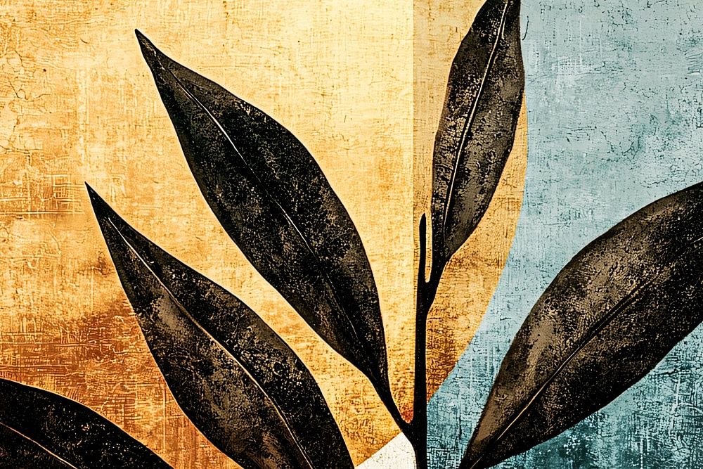This artwork exudes a harmonious and modern atmosphere, perfect for those who love a minimalist and serene look. The subtle combination of natural elements such as leaves and a radiant sun, brought together with an elegant colour composition, makes this design a real eye-catcher in any room. The contrasts between the warm gold and cool blue create a soothing yet dynamic feel. Ideal as wall decoration for living rooms, offices or other places where peace and style come together.