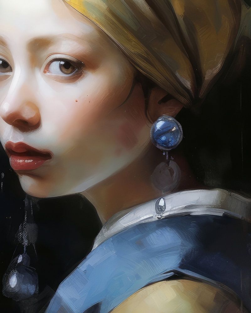 Modern version of the Girl with a Pearl Earring. Portrait of a young woman with a pearl earring, inspired by the work of Johannes Vermeer, but with a modern twist.