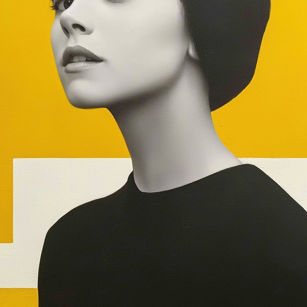 Sleek shapes and bright surfaces contrast with a soft black-and-white portrait. This lady looks like she stepped straight out of a Bauhaus film, proud and untouchable.