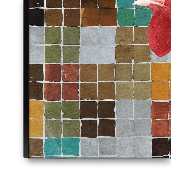 This rustic design features one of my Sussex roosters in front of colored kitchen tiles and the word "Moin", a northern German / Dutch / Danish greeting meaning "have a nice one". This work would fit nicely in a country kitchen.