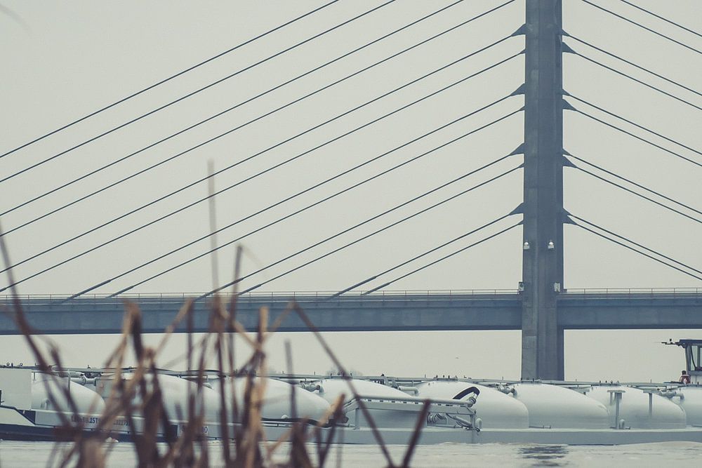 De Molenbrug over de IJssel bij Kampen, gezien vanaf het water, terwijl er net een binnenvaartschip passeert.