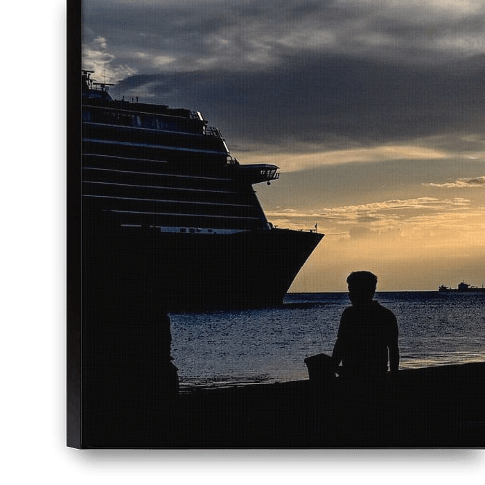 The picture shows the Molo Audace in Trieste at sunset. The sky is bathed in warm tones of deep orange, gold and pink as the sun slowly disappears behind the horizon. On the pier itself, silhouettes of people can be seen enjoying the view; on the horizon, the sea and sky merge into a soft line. Dusk sets in, creating a peaceful and…