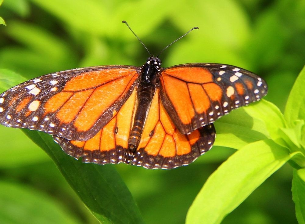 The monarch butterfly, also known as monarch or American monarch, is a butterfly in the family Nymphalidae. The monarch butterfly is one of the best-known butterfly species of North America. North American populations migrate north in large numbers in spring, developing several generations, and return south in autumn, where the species overwinters in huge groups. The monarch butterfly is a fairly large butterfly. The total body length is about 5 centimetres and the wingspan is up to 10 centimetres. The wings are conspicuously coloured, with the main colour being orange. The wing surface is divided into cells by the black wing border. The wing margin has a broad black border containing many small white spots. source wikipedia