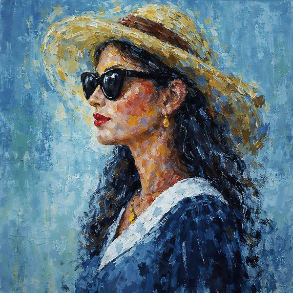 The painting depicts a woman in profile, dressed in a dark blue dress with a classic white collar. She wears a large, sunny yellow straw hat that casts a soft shadow over her face, and chic black sunglasses that give her a mysterious and sophisticated look. Her dark, wavy hair falls loosely over her shoulders, while a subtle gold…