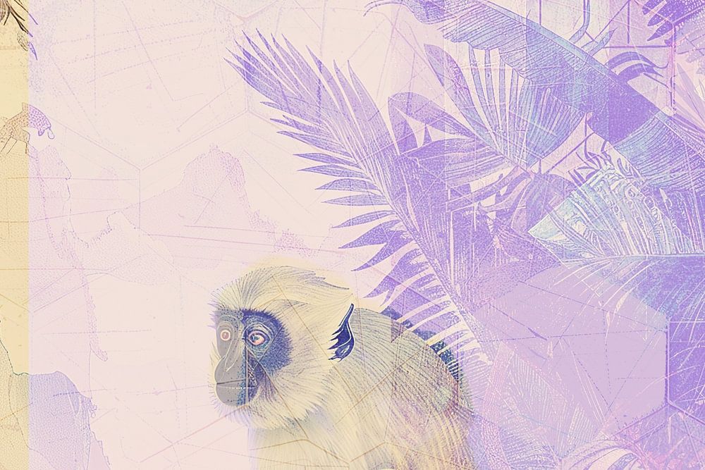 On the left, we see a detailed palm tree and a landscape with light colours tending towards pastel tones. In the centre is a monkey filtered through lilac and purple tones enveloping the leaves of tropical plants. On the right, you see abstract geometric shapes that create an optical illusion of depth, as if leading to a lighter, fading space.