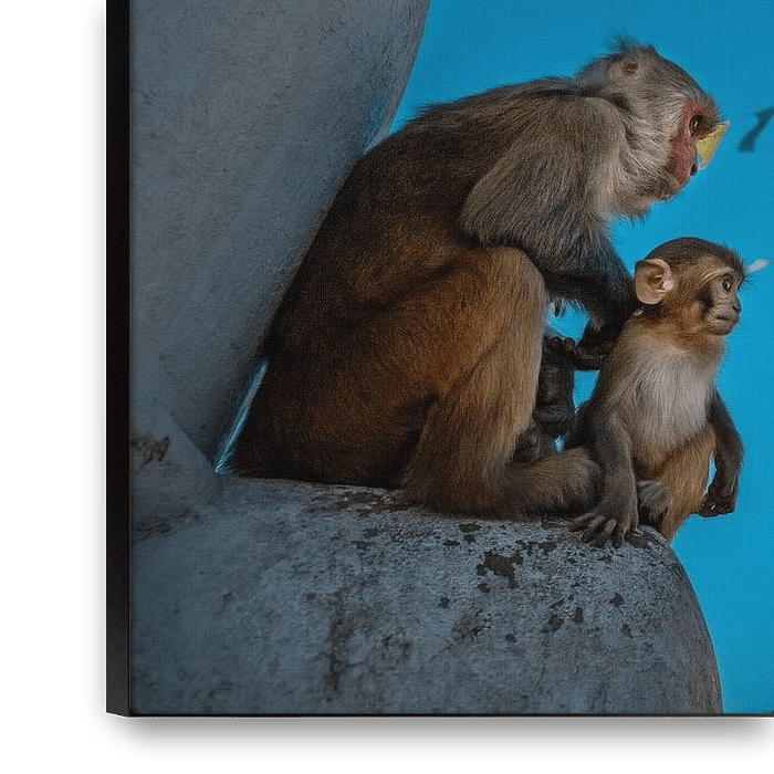 An intimate moment between a mother monkey and her young at the iconic Swayambhunath Stupa in Nepal. This photo captures the unique harmony between the sacred architecture and its wild inhabitants.