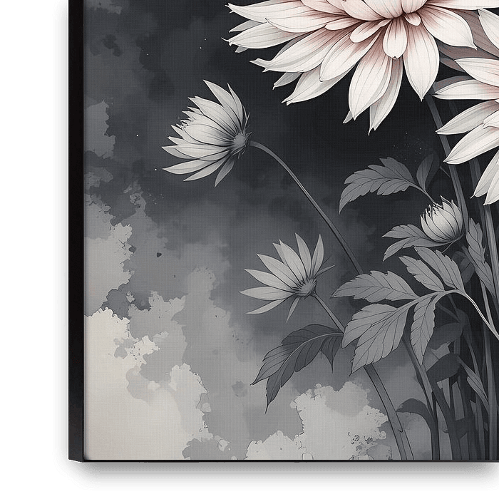 A study in contrasts, "Monochrome Bloom" features a cluster of stylized daisies rendered in a predominantly grayscale palette. Delicate hints of warm pink accent the centers of the flowers, adding a touch of subtle color and drawing the eye to their intricate details. The soft, smoky background enhances the ethereal quality of the…