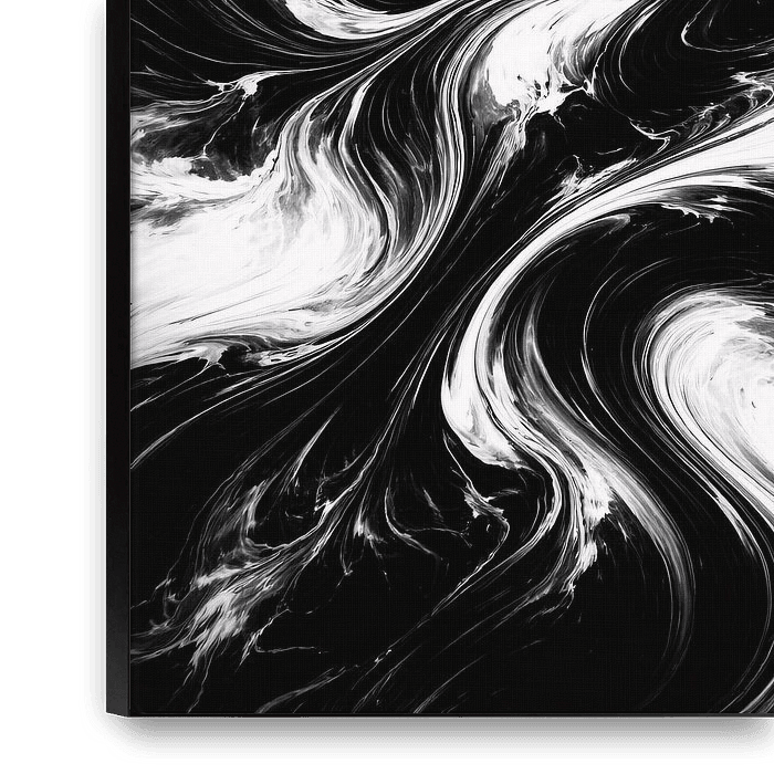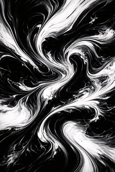 High-contrast black and white abstract fluid art featuring dynamic swirling forms and marble-like movement. Bold, dramatic, and expressive, this monochrome piece creates a striking modern statement for minimalist and contemporary interiors.