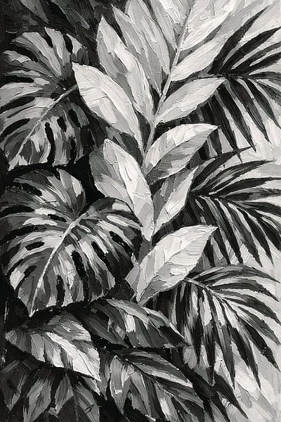 A striking black and white botanical artwork featuring dense tropical leaves arranged in a bold, high-contrast composition. The monochrome palette adds a modern and sophisticated feel suitable for minimalist or industrial interiors