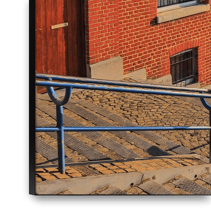 Prachtige opname van de trap Montagne de Bueren in Luik (Liege), Belgie, op een zonnige winterochtend, met uitzicht op de stad