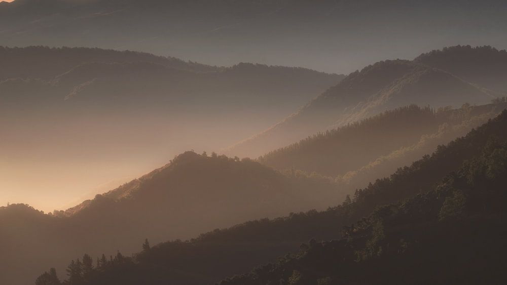 The sky was clear, and between the mountain ridges hung a veil of mist, exactly that mysterious layer I was hoping for. As the sun slowly rose, the sky coloured in soft hues of purple and gold. The layered mountain peaks unfolded like a graphic pattern, each with its own texture and tone.