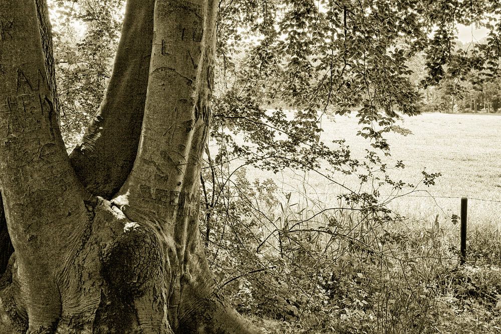 Het Velde bos nabij Zutphen in een bewerking van een landschapscene van twee vergroeide bomen en een weidelandschap op de achtergrond
