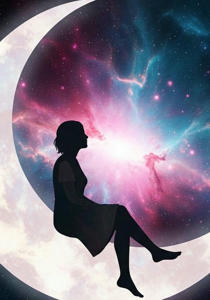 Bathed in the soft glow of the moon, she sits in quiet reflection above the sleeping world. The stars shimmer like gentle thoughts drifting through her mind, each one a memory, a dream, or a whisper from the universe. In this weightless silence, time seems to pause — only her heart and the moon breathe in harmony. Moonlight Serenity captures the beauty of solitude and the calm that comes when the soul meets the infinite. It is a moment of peace, where light and shadow dance softly upon her form, and the vastness of space becomes her sanctuary. She is both fragile and eternal, a dreamer suspended between worlds, glowing with quiet strength beneath the endless sky
