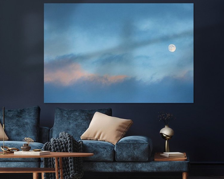 At the end of the afternoon the moon is already higher in the sky while the sun slowly sets. The blue colours and orange hue give the picture a picturesque effect. A beautiful view during the husky sleigh ride.