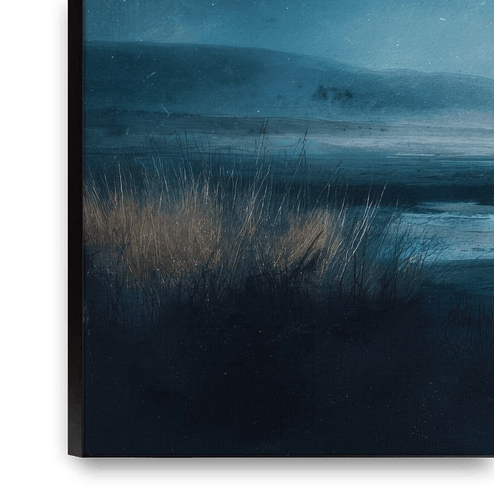 Under a bright moon, an open landscape of water and rolling hills unfolds. The night light casts a silvery glow over the silent plain, where reeds and banks barely move. The sky is deep and vast, filled with stars that reinforce the feeling of timelessness. This work captures the transition between land and water, between darkness and…