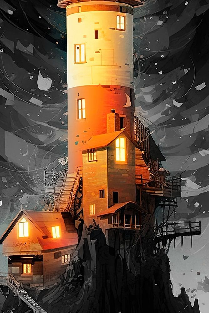 Surreal architecture is brought to life - a guardian of the sea that inspires with bright colours, fascinating details and an atmospheric mood. The surreal lighthouse symbolises the connection between reality and fantasy as it majestically watches over the sea. The image was created with the support of artificial intelligence and edited using Photoshop.