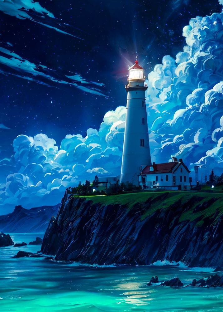 A glowing lighthouse stands tall against the night sky, guiding the waves beneath a radiant full moon. Standing on rugged seaside cliffs, this lighthouse shines its guiding light into the night. The ocean below glimmers with turquoise waves, while above, the moon illuminates a sky full of drifting clouds and countless stars. A breathtaking blend of serenity and power, this artwork evokes both solitude and wonder — perfect for lovers of nautical scenery, stargazing, and fantasy coastlines.