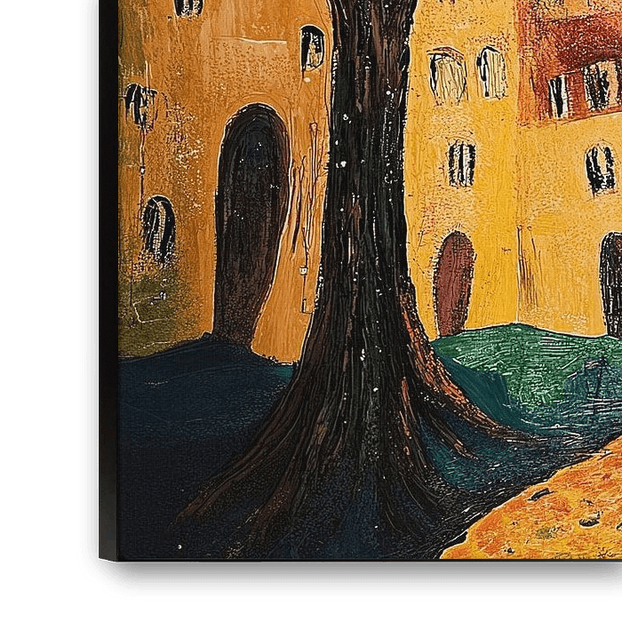 Moonlit Serenade - This colourful cityscape painting shows two dark trees with luminous leaves flanking a path between vividly coloured houses under a large full moon.