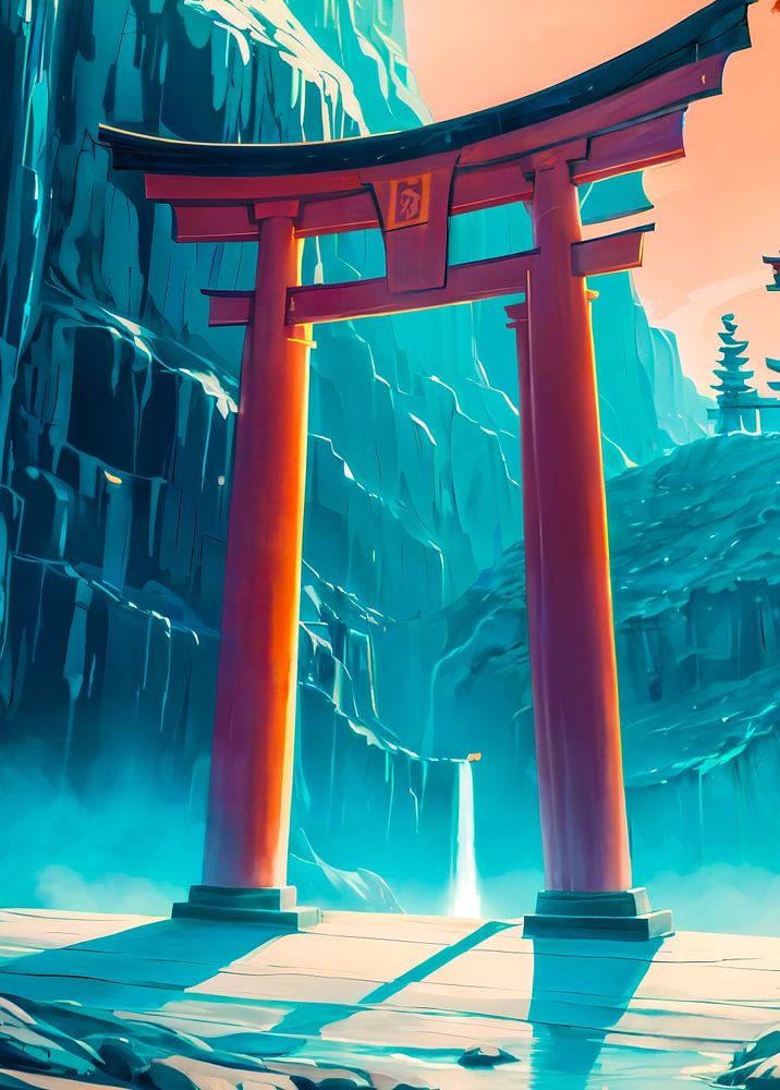 A mystical Japanese torii gate illuminated under a glowing full moon, framed by mountains and autumn trees. This artwork radiates a sense of mystery and serenity, depicting a grand torii gate standing at the heart of a mountain valley. Bathed in moonlight, the gate casts long shadows across the stone path as mist drifts from a distant waterfall. Fiery autumn leaves glow warmly against the cool turquoise cliffs, creating a striking contrast of light and color. A perfect piece for lovers of Japanese culture, spiritual symbolism, and dreamlike landscapes.