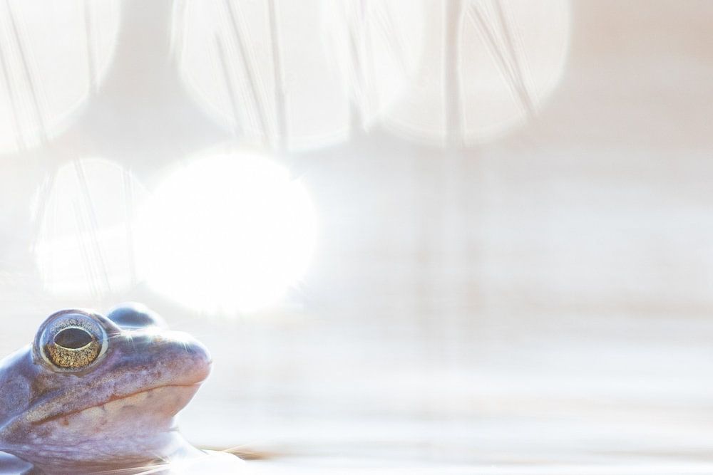 The sun still fairly high in the sky when we arrive at a beautiful wet moorland. We are looking for moor frogs. The male moor frog turns blue in spring, when the water temperature begins to rise. It is mating season for the moor frog. Once found, I lie flat on the ground and try to photograph the frogs at eye level. The bright sunlight reflects in the background of the image and makes big orbs.