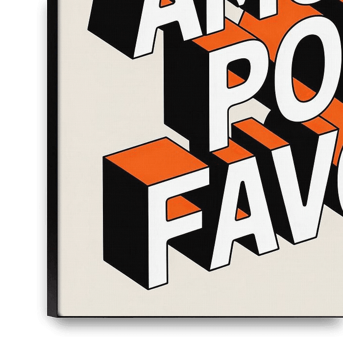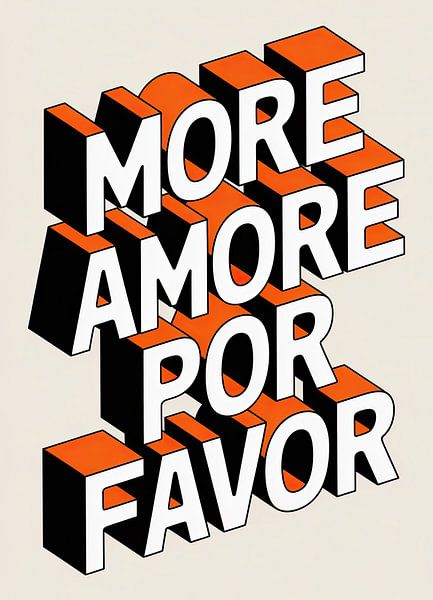 This work features the lettering "MORE AMOR FOR FAVOR" in three-dimensional block typography on a light beige background. The letters are bold and feature a combination of white fronts, black outlines and bold orange accents. The vertical staggering and slight offset of the words creates a dynamic depth effect. Subtle drop shadows…