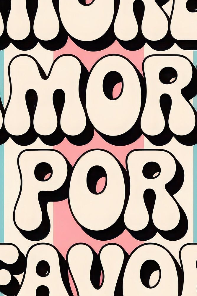 Retro groovy poster with the words "More Amore Por Favor". Striped background in pastel pink, blue and cream combined with 70s typography for a colourful, playful and eye-catching retro design.