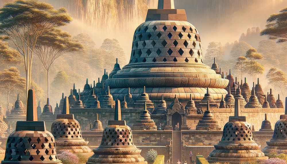 Step into the serene aura of Borobudur, Indonesia, As dawn breaks, the first rays of sunlight tenderly kiss the majestic temple, illuminating its pyramid-like structure and intricate relief panels. The scene is nestled amidst a cradle of lush greenery, tall trees, and blooming flowers, symbolizing the temple’s symbiotic relationship with nature. A diverse assembly of visitors, both locals and tourists, are depicted exploring the temple grounds, their awe reflecting the architectural splendor and historical richness of Borobudur. The early morning light casts a tranquil and captivating atmosphere, inviting a sense of peaceful reflection amidst the beauty of Indonesia's cultural heritage.