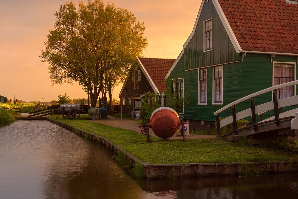 The Zaanse Schans is a beautiful, unique village in the west of the Netherlands, full of wooden houses, windmills, barns and workshops from the Zaan region. The Zaanse Schans is located in the municipality of Zaanstad along the Zaan river. The photo shows the cheese farm Catharina Hoeve and the paint mill De Kat at sunrise.