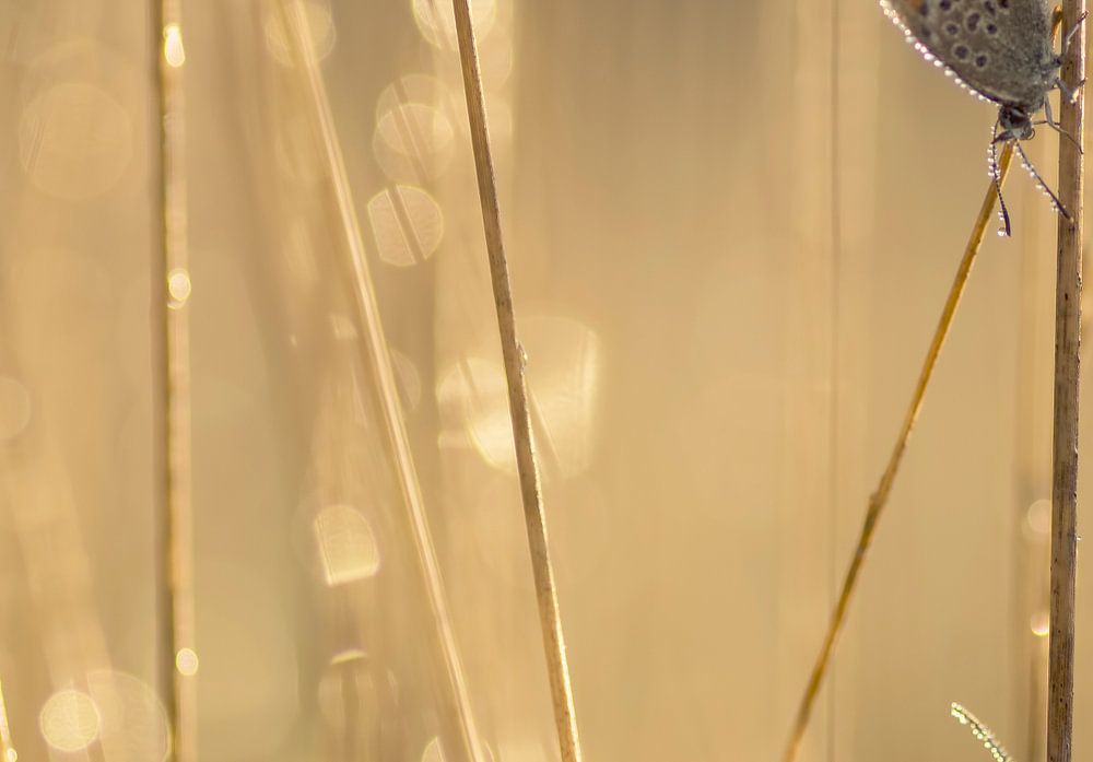 On this Monday morning I set the alarm very early. After a 1 hour drive I parked my car at 5 AM in the parking lot. The sun was risingalready behind the light fog, I hurried to the field. There were the cute Silver-studded Blues, dotted with dewdrops. Waiting for the sun to evaporate the drops and warm their wings. Until then I was able to photograph these two lovely butterflies in their golden and sparkling surroundings. What a feast!