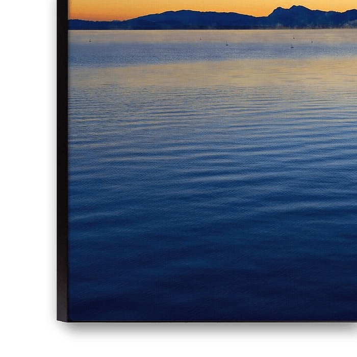 "Morning calm on the lake" captures the magical moment when night gives way to the first light of day. The sky shows a delicate play of colours of deep blue and warm gold, while the mountain silhouette rests majestically in the background.