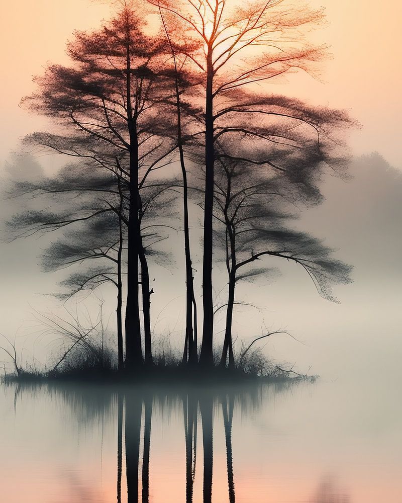 Buy this landscape artwork Morning mist on the lake by fernlichtsicht on canvas, ArtFrame, poster and wallpaper, printed on demand in high quality.