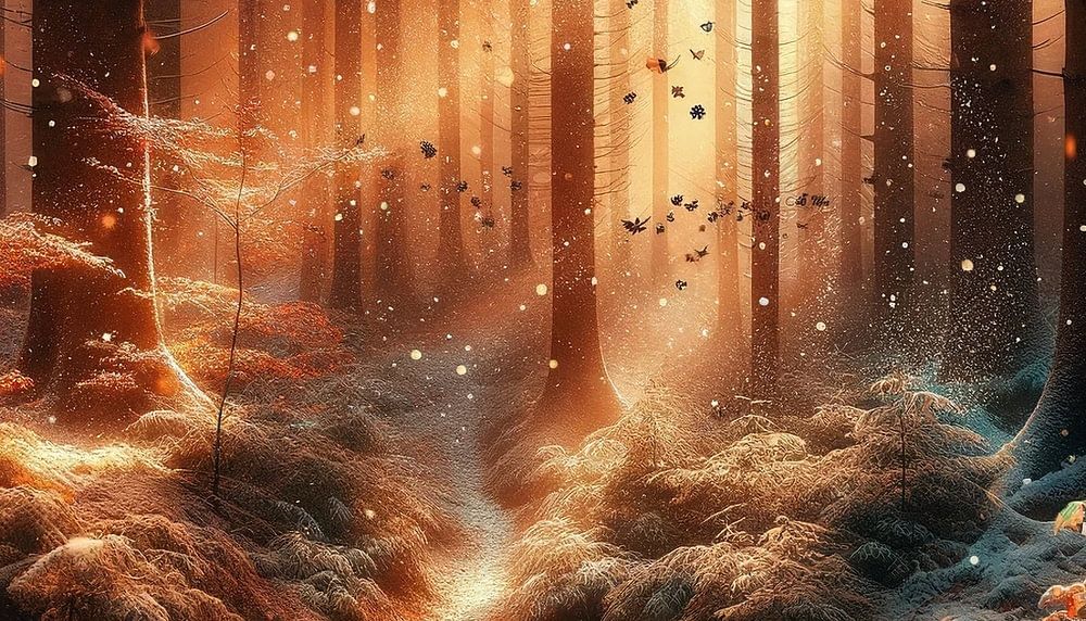 The picture captures the first warm rays of the morning as they shine through an enchanted, frost-covered forest. The ground is strewn with ferns and foliage, their contours sharply outlined in the golden light. Here and there, red leaves light up, adding splashes of vivid warmth to the picture. The tree trunks stretch towards the sky and seem to collect the light in their bark. The atmosphere is dynamic yet peaceful, as if the particles of light are dancing and celebrating life itself. This image speaks of renewal and the eternal cycle of nature, of the end of night and the beginning of a new day.