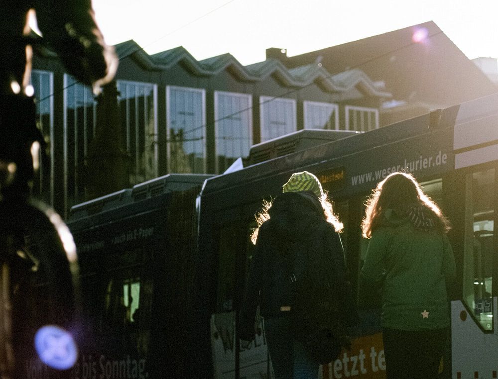 Early morning in a small German city. A rider and two shoppers brave the early frost to get through the city centre.