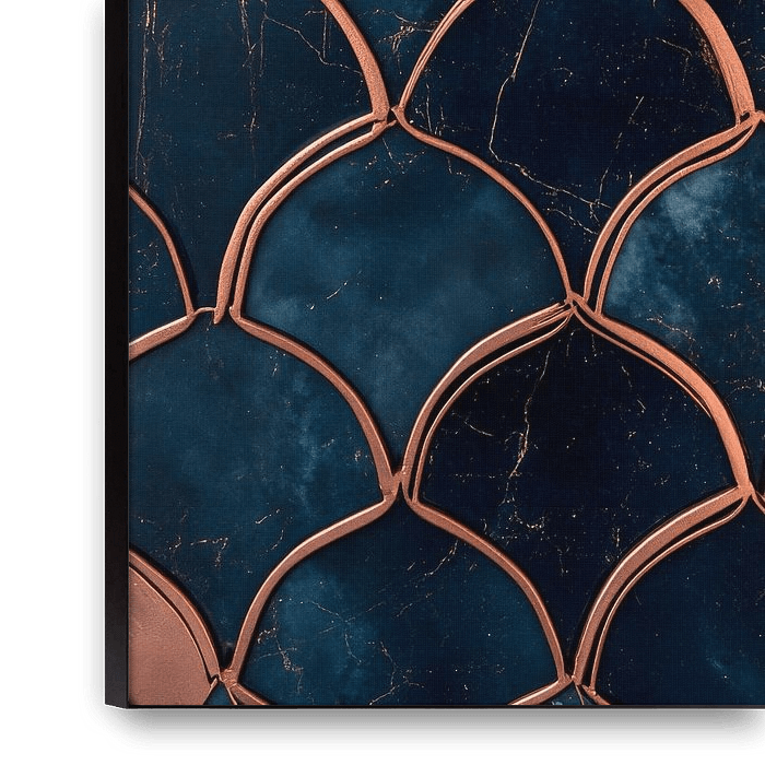 A fascinating patterned landscape unfolds in deep blue tones, interspersed with elegant copper lines. The curved shapes are reminiscent of an artistic mosaic that harbours secrets and stories. This combination of glossy and matt surfaces lends the room a sophisticated atmosphere and invites you to marvel. A harmonious interplay of…