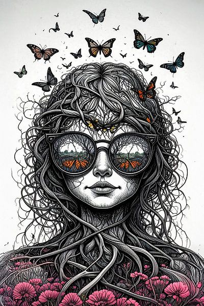 A drawing of a woman constructed from branches and roots. She wears large glasses in which a landscape with colourful butterflies is reflected. Coloured butterflies fly around her head and pink flowers can be seen in the foreground. The woman is depicted entirely in black and white. A surrealistic illustration with characteristics from…