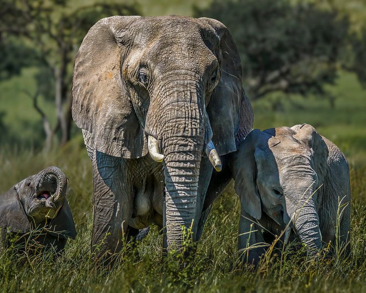 Mother elephant with smiling baby elephants in tall grass by Erwin Floor