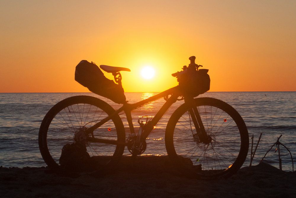 Niets is mooier dan na een mountain bike rit te eindigen op het strand en te genieten van de ondergaande zon. Dit kan zeker heel mooi op het strand bij Migliarino, vlakbij Pisa, in Italië. De mountainbike heeft een robuust bamboeframe en bevat waterdichte fietstassen voor de mountainbike.