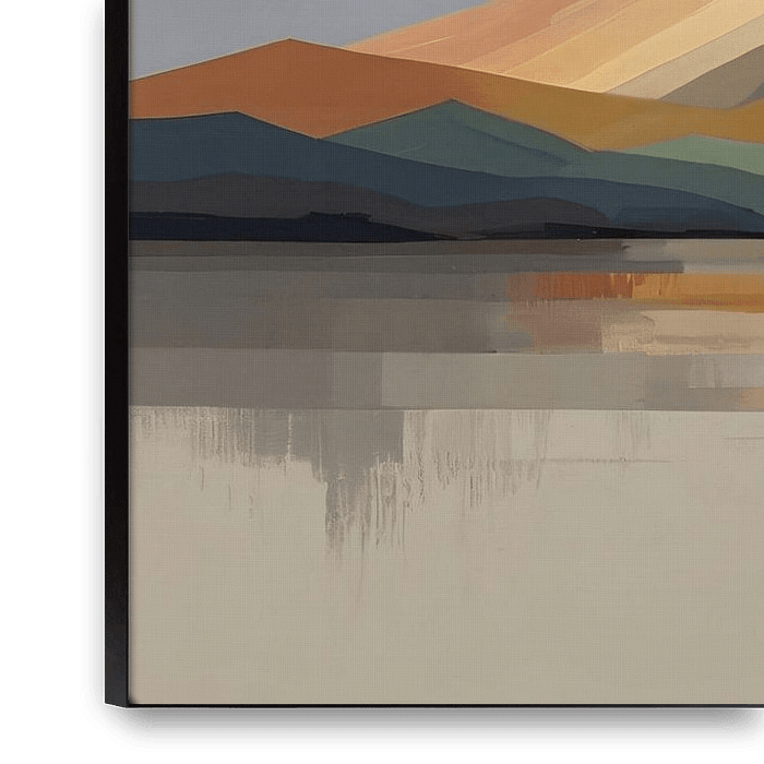 This beautiful artwork invites a moment of contemplation and tranquillity through its simplified depiction of a mountain landscape. The clean lines and bold colour areas combine to create a minimalist piece that gives a modern twist to classic nature scenes. The reflection of the mountains in the still water creates a symmetrical…