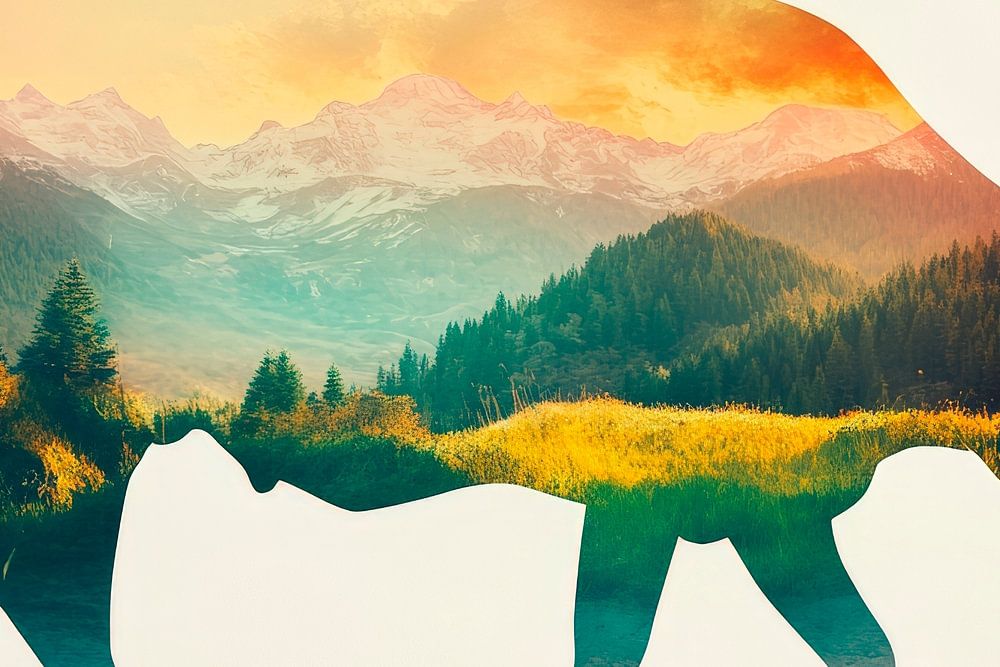 The silhouette of a majestic cow shimmers in soft colours as it wanders through a dreamlike landscape of mountains and meadows. The harmonious connection between animal and nature creates a calming atmosphere, perfect for the living room, where it can radiate cosiness and a touch of rural elegance.