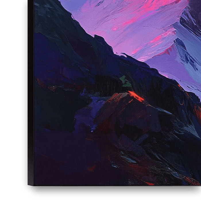 Mountain landscape - This landscape painting shows a dramatic mountain range illuminated by the vibrant spectrum of sunset colours, with emphasis on majestic purple and pink hues dancing across the snow-capped peaks.