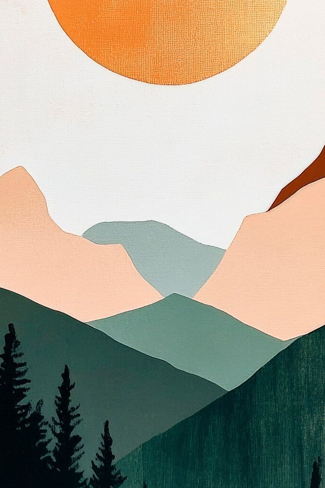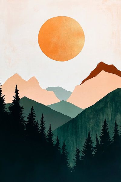 Imagine a peaceful landscape in which gentle mountain peaks are framed by deep pine forests. The warm, golden sun shines over the heights and gives the room a calming energy. This artwork is perfect for the living room to create a harmonious and inviting atmosphere.