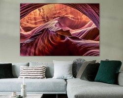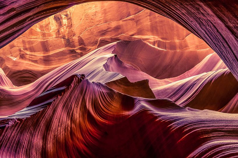 Colourful waves, formed by wind and water in the rocks into a beautiful play of lines. The incidence of light creates beautiful colours, from red to purple to orange. This picture was taken in Lower Antelope Canyon in Page, Arizona.