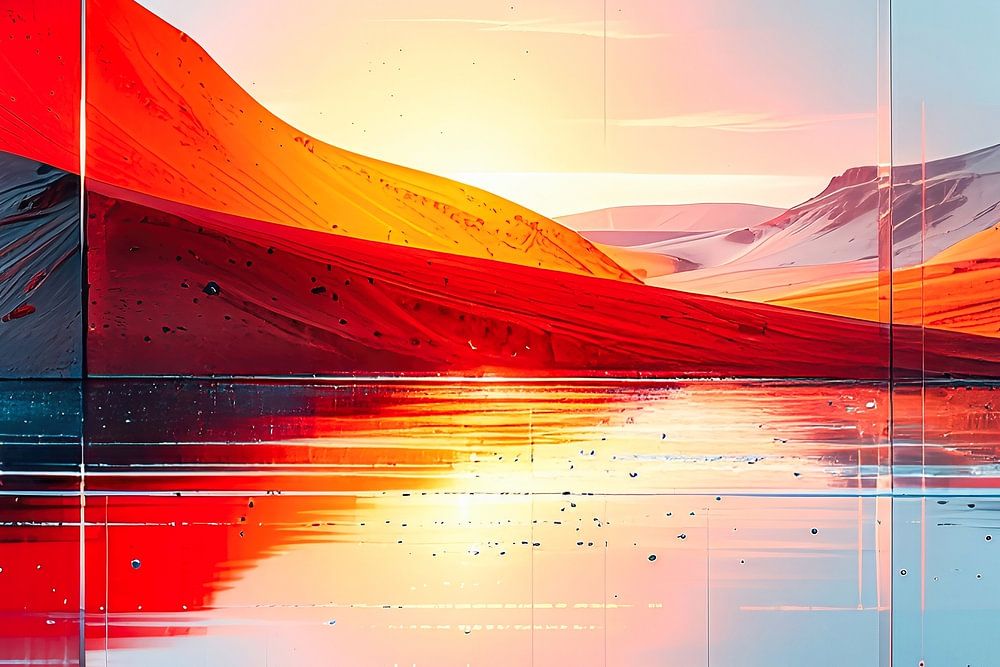 Mountains with vibrant red and orange colours are beautifully reflected in a calm, mirror-like body of water, while the sun sets in the distance. Transparent geometric shapes in glass-formism style overlay the landscape and give the scene a modern and abstract element......Digital art image, design and composing by me, visualisation with AI