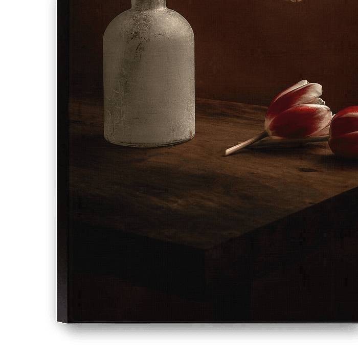 Deep dark colours, this still life of Dutch tulips is perfect for a modern interior.