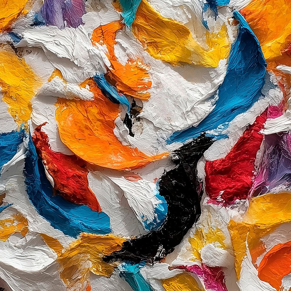 Abstract artwork with a dynamic composition of vibrant colours, the textured surface shows swirls and curves, creating a sense of movement and energy throughout the composition. The background is predominantly white, which contrasts with the bright colours and enhances the overall visual impact.